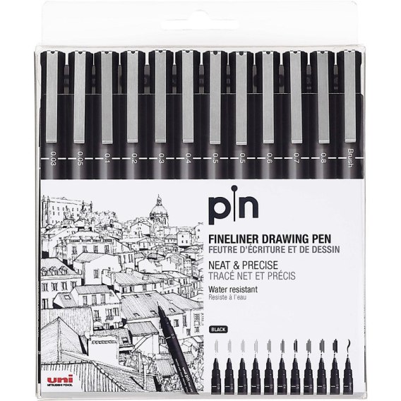 * profesjonalny cienkopis kreślarski idealny do kreślenia (dla grafików, projektantów, artystów) • tusz pigmentowy, wodoodporny i odporny na blaknięcie • odporny na działanie wody, słońca, alkoholu, amoniaku i rozpuszczalników • nie przesiąka przez papier • twarda końcówka fibrowa nie ulega dyspersji (rozwarstwieniu) • grubość końcówek i kolor tuszu: - czarny: 0,03 - 0,05 - 0,1 - 0,2 - 0,3 - 0,4 - 0,5 (x2) - 0,6 - 0,7 - 0,8 - BRUSH