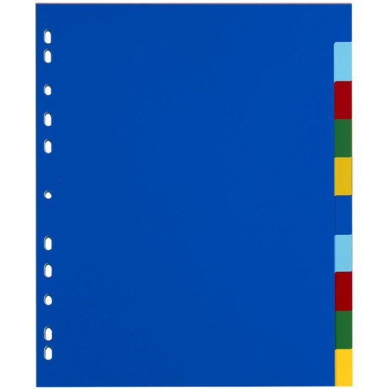 * Kolorowe przekładki w powiększonym formacie A4+, wykonane z wytrzymałego polipropylenu odpornego na zniszczenie - doskonałe do organizowania dokumentów w segregatorze. Komplet zawiera 10 przekładek z niezadrukowanymi indeksami. Na pierwszej karcie umieszczono specjalne miejsca do opisu zawartości.